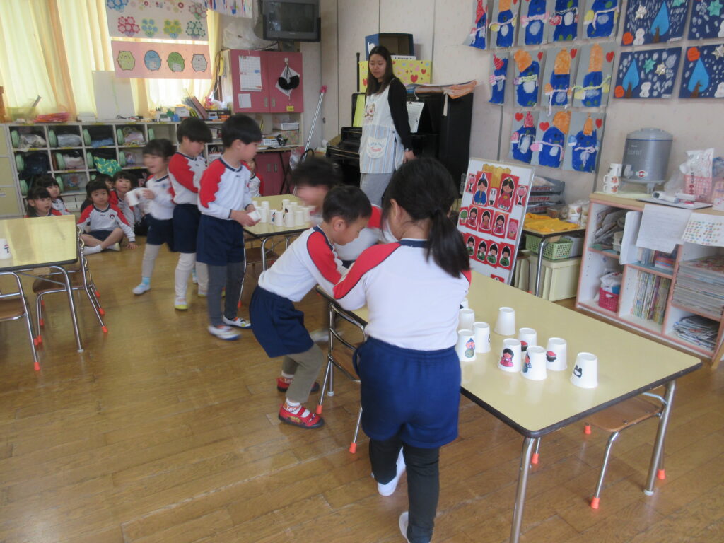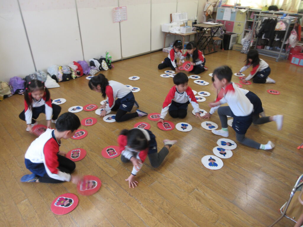 オセロゲーム♬お内裏様チームとお雛様チームに分かれて勝負しました!プレートの数が多かった方が勝ち!!みんな頑張れ~😊