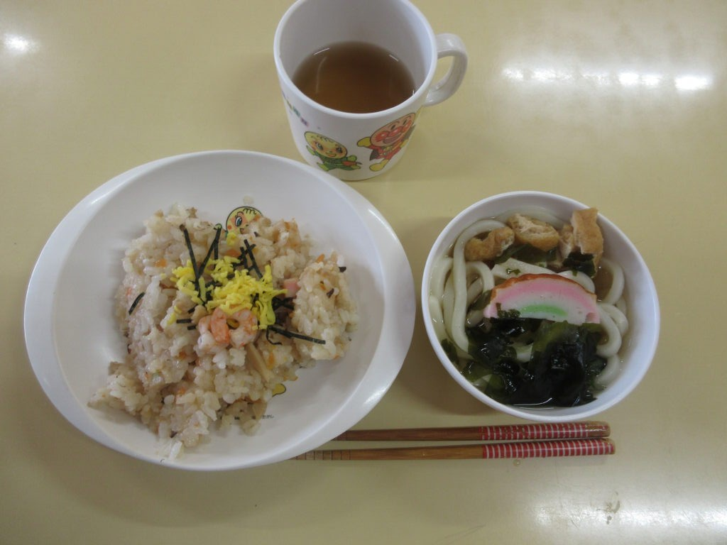今日の給食は「ひなまつりメニュー」ちらし寿司とうどんでした♬